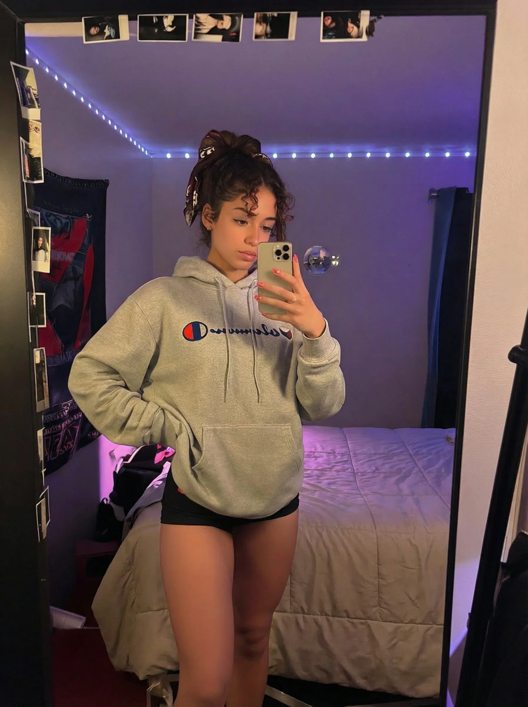 Bedroom selfie, cozy morning, oversized sweater, natural light from window, intimate casual